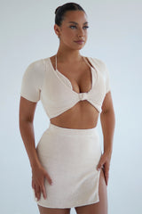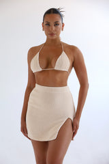 Featured from our super exclusive ‘Textured Range’, this three piece set is the ultimate summer set! Featuring a halter neck triangle bralet covered with a bust flattering knot style crop stop and a high thigh slit flowing skirt, this piece is the ultimate pool party or festival vibe! Ready to be styled separately or as a se