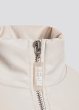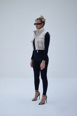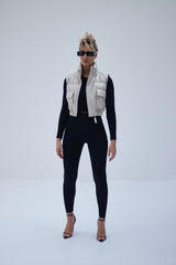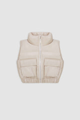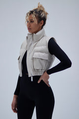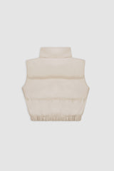 Make a statement in our Vegan Leather Cropped Puffer Gilet. Crafted from a soft cream vegan leather with a 100% cotton filling. Featuring a high collar, outer utility pockets with inside hidden pockets.